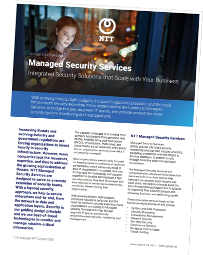 At the Managed Services division of NTT, security is built into our DNA. Unlike other MSPs, we employ a “Secure by Design” philosophy where we include comprehensive security services as part of our core managed services offering.
